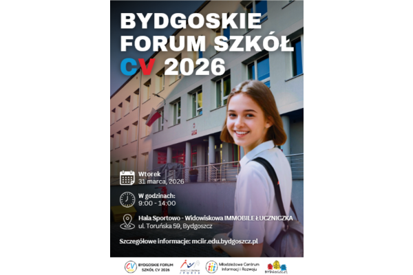 Bydgoskie Forum Szkół CV 2026 odbędzie się we wtorek 31 marca 2026 r. w Hali Sportowo-Widowiskowej IMMOBILE ŁUCZNICZKA przy ul. Toruńskiej 59 w Bydgoszczy w godzinach od 9:00 do 14:00.