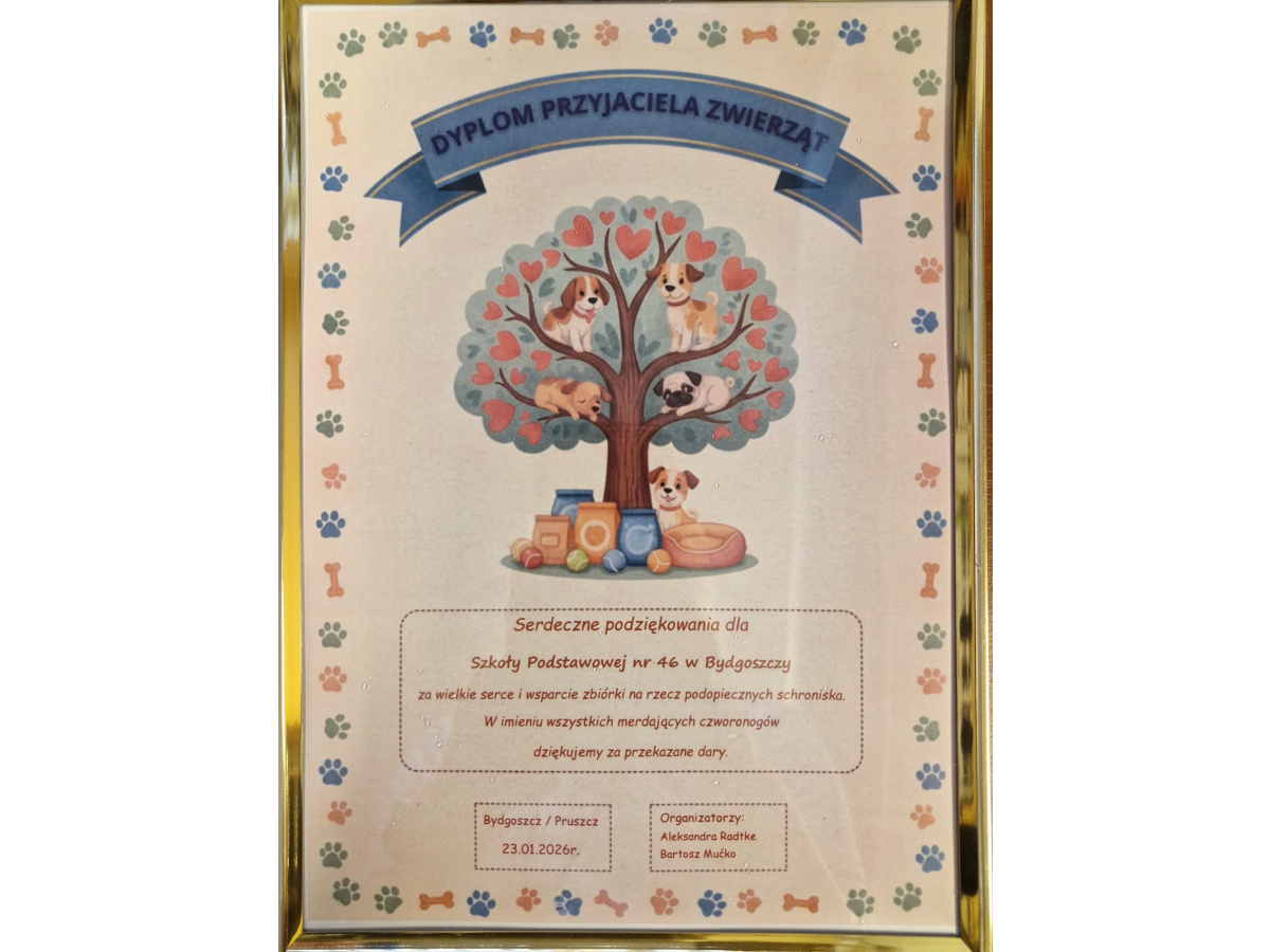 Wsparcie trafiło też do Schroniska dla Zwierząt w Bydgoszczy. Darowiznę w kwocie 130 zł przekazała klasa 5b. Pieniądze zostały zebrane na kiermaszu świątecznym.