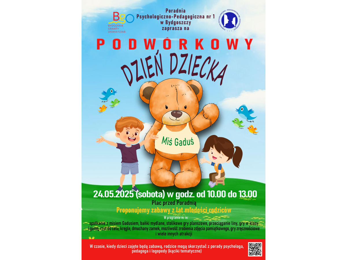 Wydział Edukacji i Sportu wraz z Dyrektorem Poradni Psychologiczno-Pedagogicznej nr 1 w Bydgoszczy serdecznie zapraszają wszystkie dzieci i młodzież z rodzicami na II Rodzinny Piknik Rekreacyjno-Sportowy - "PODWÓRKOWY DZIEŃ DZIECKA Z PORADNIĄ PSYCHOLOGICZNO-PEDAGOGICZNĄ NR 1", który odbędzie się w sobotę 24 maja 2025 r. w godzinach od 10.00 do 13.00 na terenie parkingu Poradni przy ul. Jana III Sobieskiego 10 w Bydgoszczy.