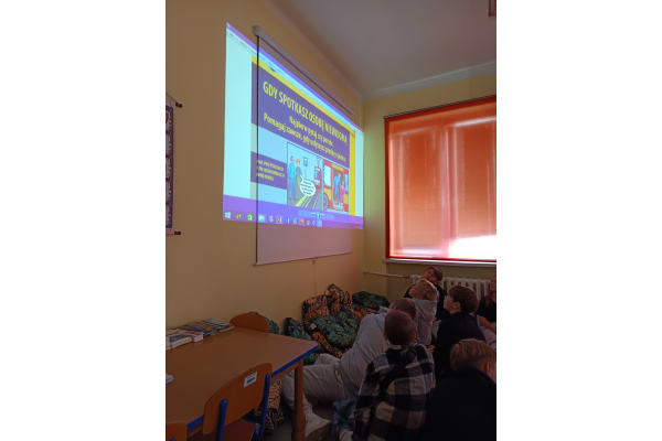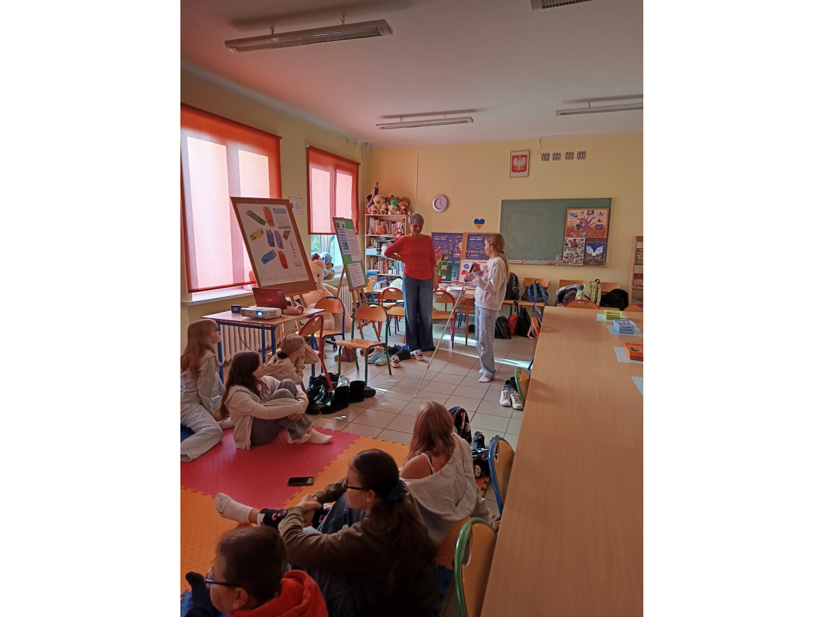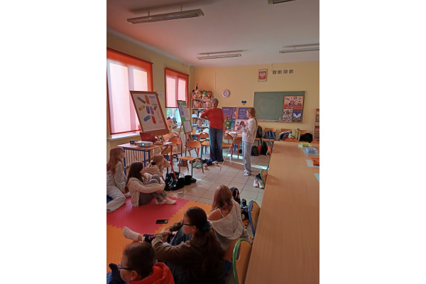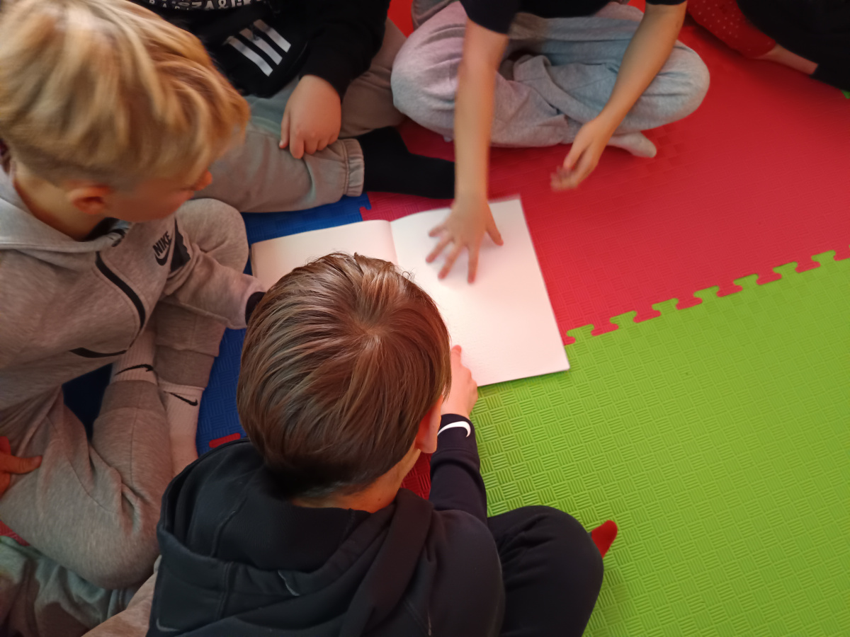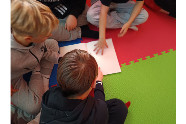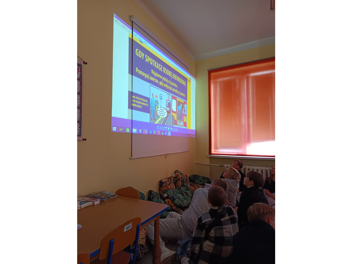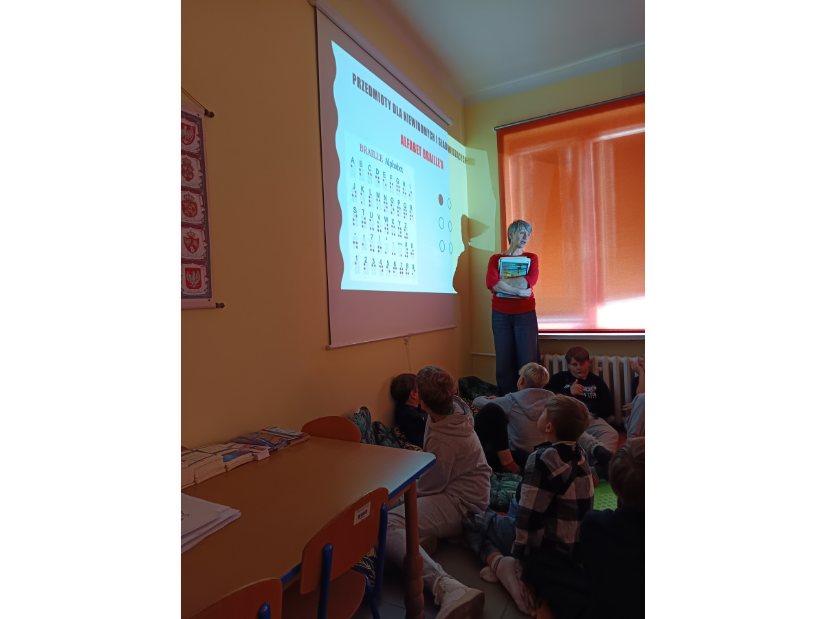 Klasa 5b wzięła udział w zajęciach edukacyjnych w Wojewódzkiej Bibliotece Pedagogicznej. Ich celem było zrozumienie świata osób niewidomych. Lekcja "Poznajmy się w ciemności" nauczyła, jak pomagać osobie niewidomej.